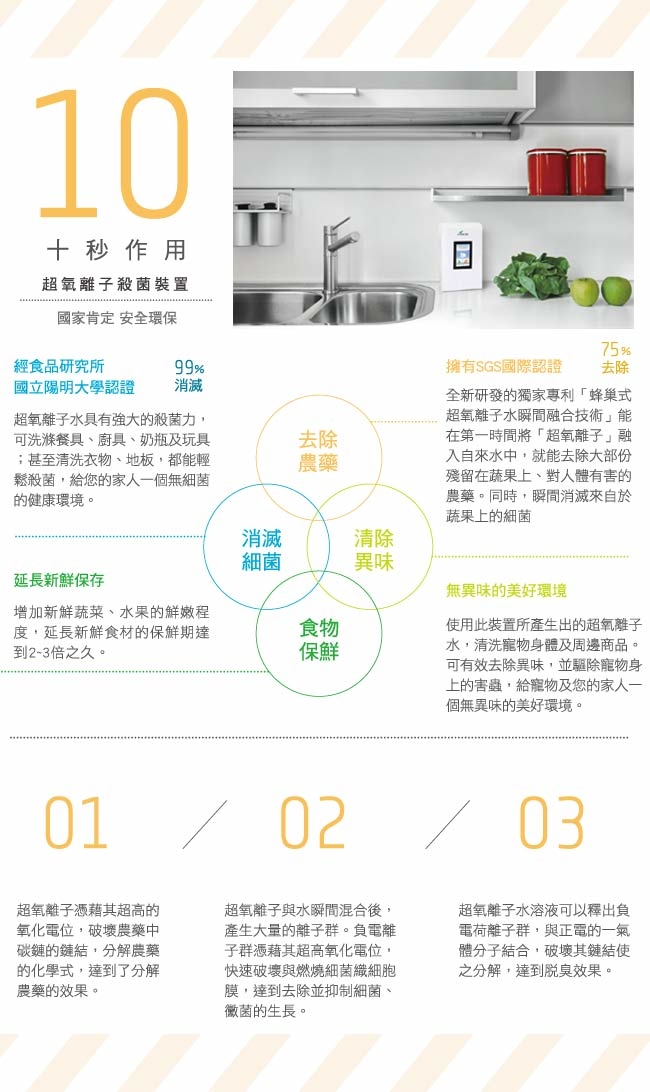 去除農藥:擁有SGS國際認證。全新研發的獨家專利「蜂巢式超氧離子水瞬間融合技術」能在第一時間將「超氧離子」融入自來水中,就能去除大部份殘於在蔬果上,對人體有害的農藥。同時,瞬間消滅來自於蔬果上的細菌。